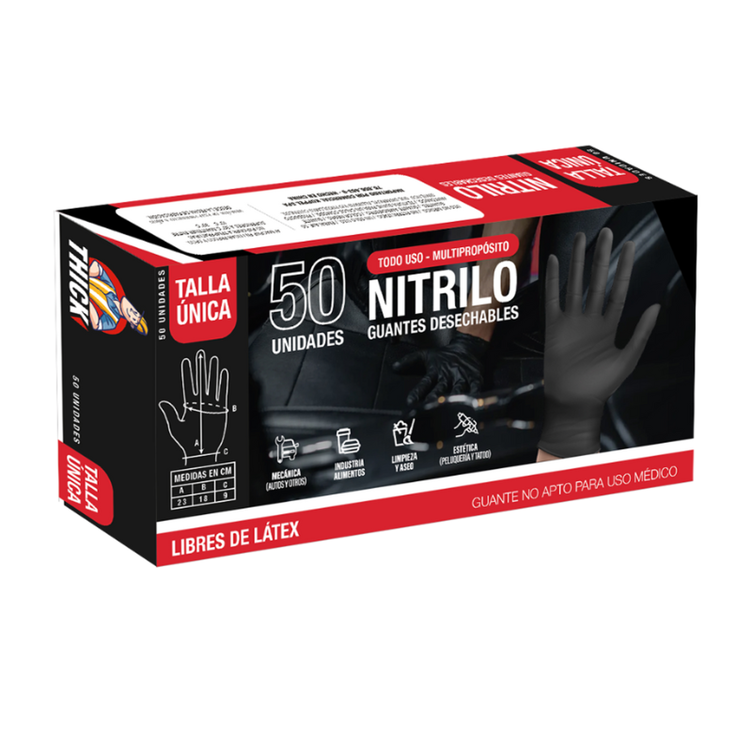 - Composición: 100% nitrilo sintético, lo que ofrece alta resistencia y protección frente a productos químicos y abrasivos.